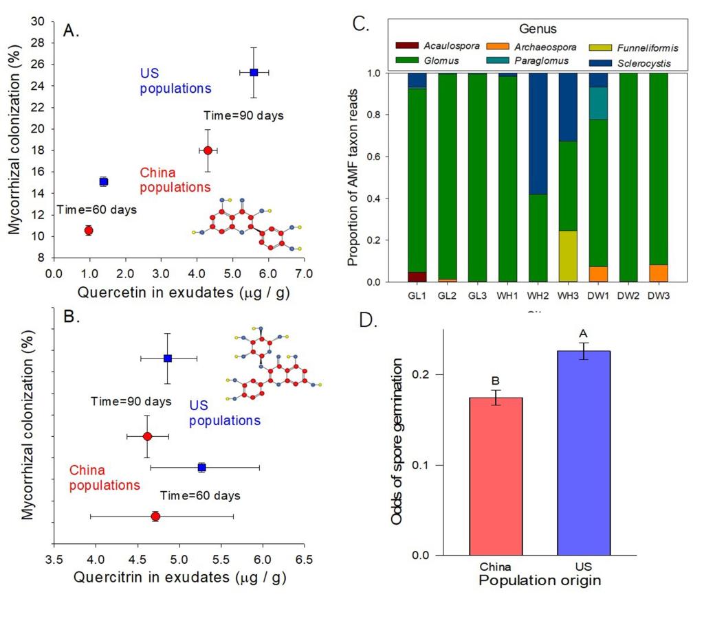 在此工作中,研究人员首先通过同质园实验,比较了外来入侵植物乌桕的入侵种群(美国种群)与原产地种群(中国种群)与AMF的互惠关系,发现入侵种群建立了更强的互惠关系(菌根真菌寄生率高,植物生物量大),化学分析同时发现入侵种群根系分泌物中类黄酮(槲皮素和斛皮苷)含量高于原产地种群。因为槲皮素和槲皮苷是两种广为报道的对AMF侵染具有促进作用的化学信号物质,所以该实验结果暗示了根系分泌物和类黄酮变化对植物-AMF互惠关系具有很强的影响;而后进行的根系分泌物添加实验便证明了,入侵种群根系分泌物比原产种群根系分泌物具有更强的促进AMF生长的作用,而活性炭添加实验则从再次反向验证了根系分泌物中活性代谢物对AMF-入侵植物互作的作用;最后,为了证实根系分泌物中类黄酮的作用,又进行了添加槲皮素和斛皮苷对AMF寄生率的实验以及室内孢子萌发实验,最终发现入侵种群中较高浓度的槲皮素是导致入侵种群AMF寄生率提高的原因。该研究运用化学生态学理论和技术,不仅从植物与菌根真菌互作演化角度成功阐明了“促进共生假说”的机理,深入揭示了植物入侵机制,还将为深入探究根系分泌物对植物与土壤微生物互作关系演化及机制提供了新的视角。