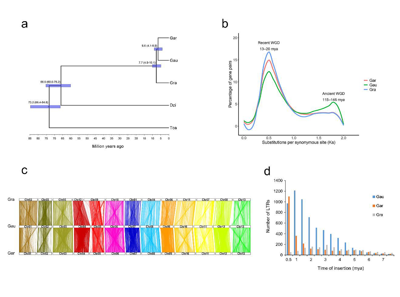 二倍体野生棉种澳洲棉具有抗黄萎病、抗枯萎病、抗旱和腺体延缓形成(种子无腺体而植株有腺体)等优良性状。澳洲棉全基因组测序对于深入了解棉属植物进化历史,推动棉花抗逆育种和棉花种子蛋白与油脂资源的安全有效利用、助力粮食安全具有重要意义。研究人员通过整合PacBio,Illumina short read,BioNano(DLS)和Hi-C技术获得了高质量的澳洲棉基因组,其Contig N50为1.83Mb,Scaffold N50 为143.60 Mb。通过比较基因组分析发现,澳洲棉相对于雷蒙德氏棉而言与亚洲棉亲缘关系更近,在大约6.6百万年前分化为两个不同的种。