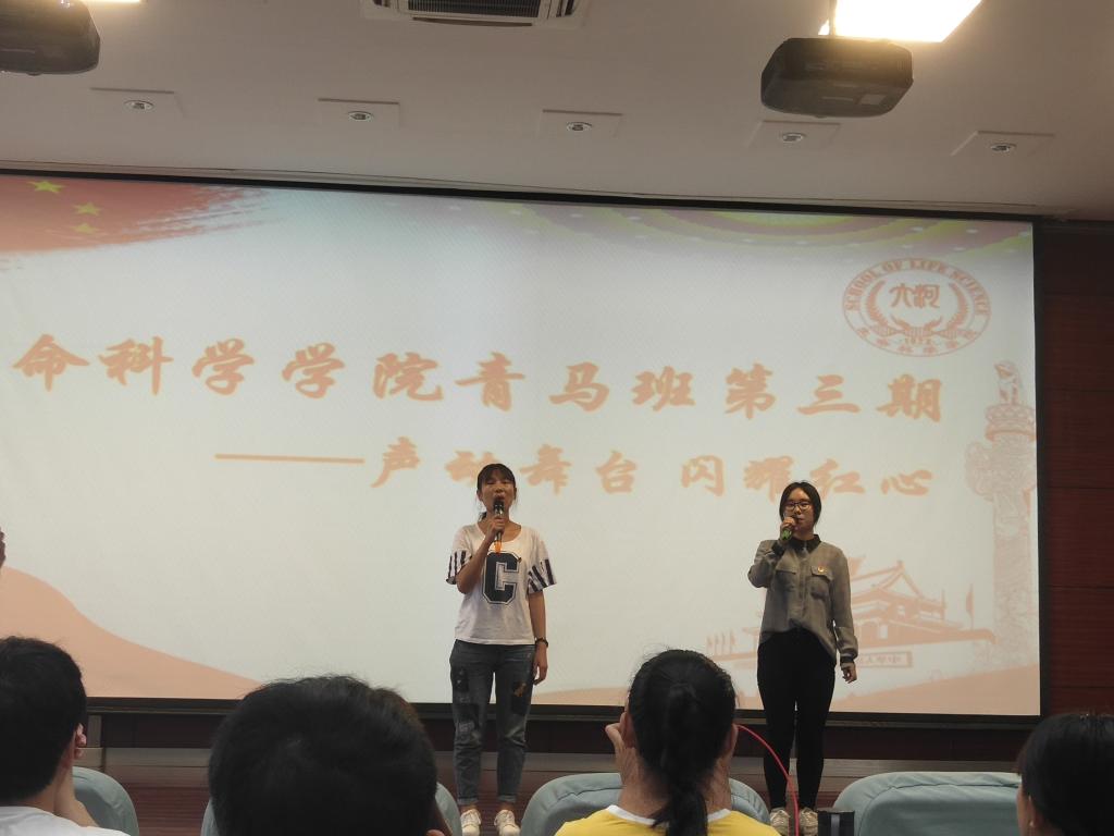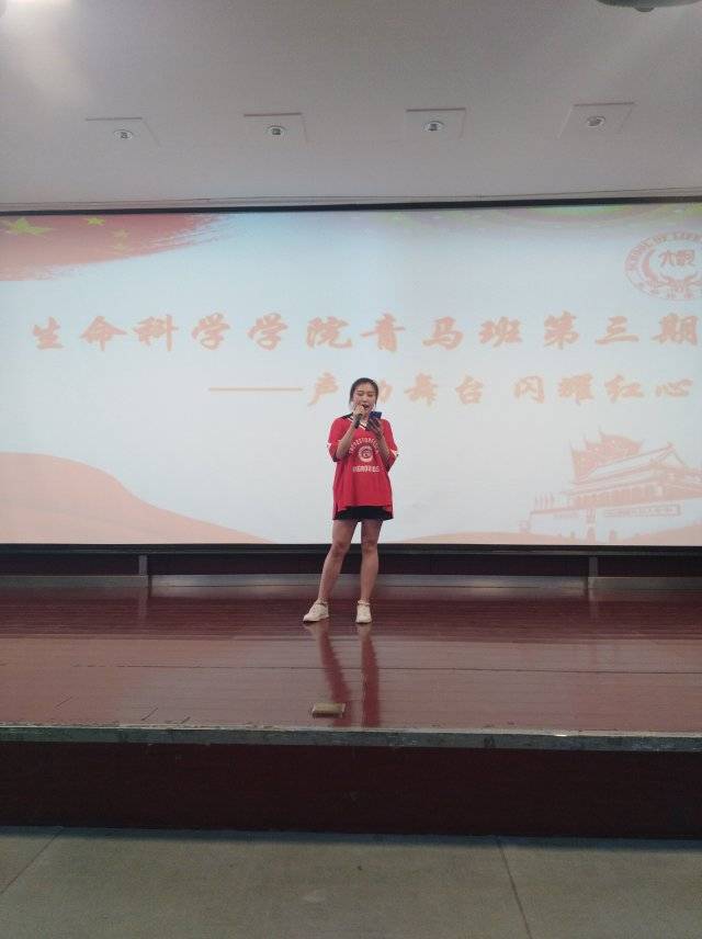 2017级学员靳聪丽、何梦如合唱了《映山红》,嘹亮的歌声余音绕梁;2017级生物科学班的李渌芊带来的革命红歌更是赢得满堂喝彩,优美的歌声在报告厅久久回荡;接下来,各年级的青马班成员带来了动听的大合唱,2017级生物工程专业学生带来的《红旗飘飘》,2018级植物科学与技术班同学带来的《强军战歌》,2018级生物科学班同学带来的《歌唱祖国》,2018级生物工程班同学带来的《迎风飘扬的旗》等革命歌曲都展示了同学们良好的精神风貌与爱国热情,让场下观众感受到了浓烈的革命情怀。