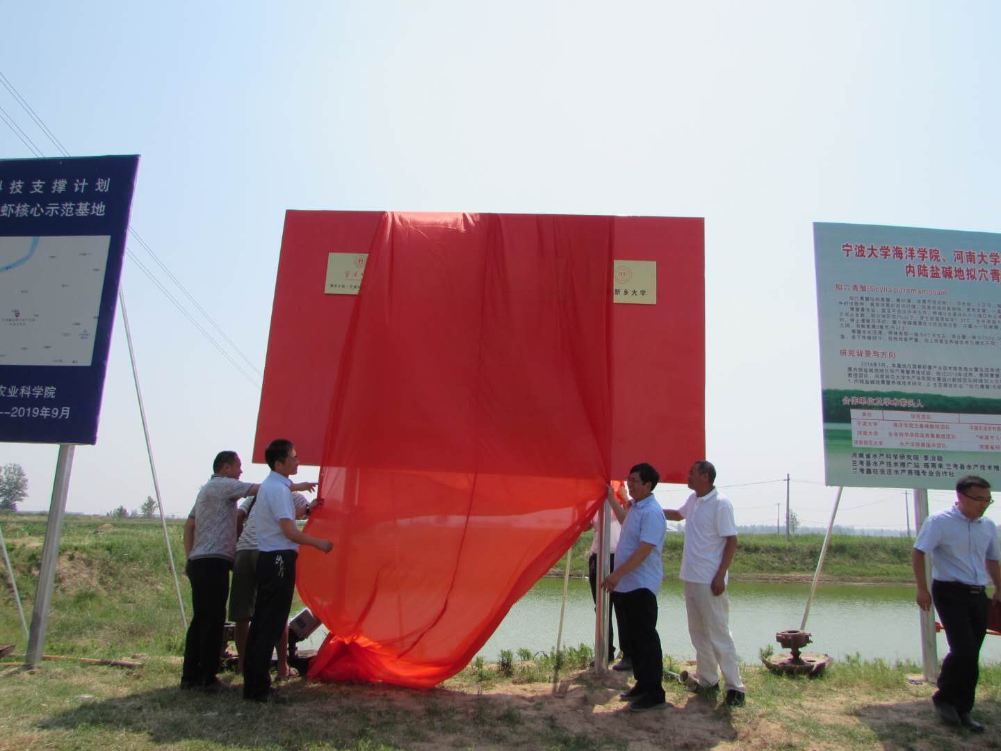 6月14日上午,永利集团304am登录现代农业与生物技术研究院张庄基地揭牌仪式在兰考县东坝头镇张庄村鑫旺水产养殖基地举行。永利集团304am登录党委书记赵东保、学院常务副院长苗雨晨、副院长王道杰,美术学院副院长、驻通许县前付村省派第一书记梁刚,河南省水产科学研究院陈杰研究员、东坝头镇镇长蔡尚锋、兰考县水利局副局长程文亮、兰考县水产技术推广站站长陈雨来、通许前付村党支部书记夏凤成、张庄村党支部书记申学风、鑫旺水产养殖合作社负责人张四培以及相关领导、专家出席揭牌仪式。