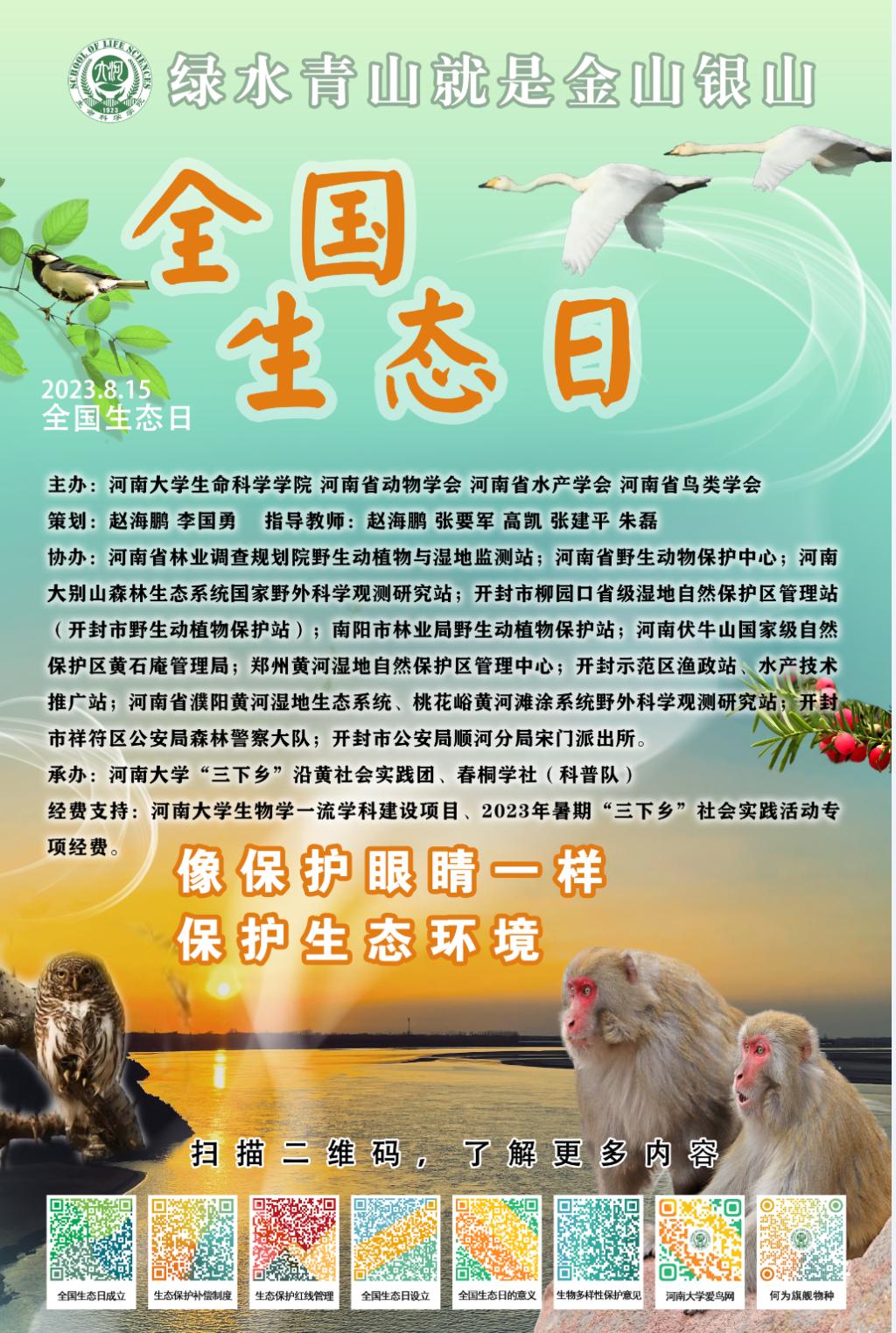 为迎接首个全国生态日(8月15日),永利集团304am登录提早准备,精心安排,近日来,围绕“绿水青山就是金山银山”主题开展了科普宣讲、海报张贴和文创产品分发等系列活动,场所除永利集团304am登录校园外,还包括开封柳园口省级湿地自然保护区、开封市水稻乡杨桥社区、沙门村以及开封市中国式摔跤协会运动训练基地等,并在“2023河南省动物学会教学科研研讨会”上介绍了科普活动产品和方案,得到了来自27家参会单位80余参会嘉宾、代表的高度肯定和认可。