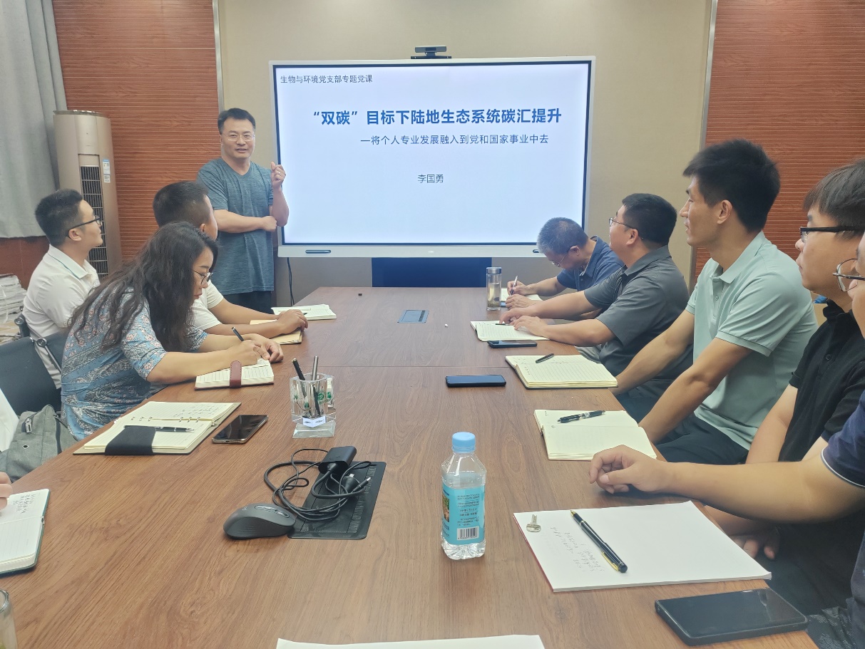 副院长李国勇为大家作专题党课《“双碳”目标下陆地生态系统碳汇提升-将个人专业发展融入到党和国家事业中去》,带领大学共同学习习近平总书记关于推动实现“双碳”目标的讲话。他说实现“双碳”目标是国家重大需求,陆地生态系统中的森林、农田等是实现“双碳”目标的重要途径,作为生态学研究者应该瞄准国家重大需求,着力突破生态学“卡脖子”问题。