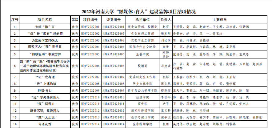 根据《2022年永利集团304am登录网络文明建设暨“融媒体+育人”工作方案》和《关于开展2022年永利集团304am登录网络文明建设暨“融媒体+育人”工作的通知》,近日,经评审组初审和终审,学校公布各项目结项等级,同时评选出“融媒体+育人”建设品牌项目优秀组织单位及优秀先进个人。