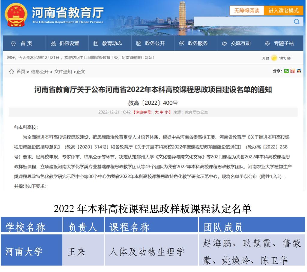 近日,河南省教育厅公布河南省2022年本科高校课程思政项目建设名单(教高〔2022〕400号),永利集团304am登录王来副教授主持的《人体及动物生理学》被认定为河南省课程思政样板课程,永利官网连续3年在省级课程思政样板课程建设取得佳绩。