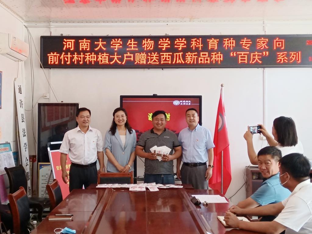 在党员集体重温入党誓词后,永利集团304am登录育种专家向前付村种植大户赠送西瓜新品种“百庆”种子,让优良的种子扎根乡村,造福人民。大家又到田间地头,查看西瓜的长势和麦收情况,现场指导群众西瓜种植技术。
