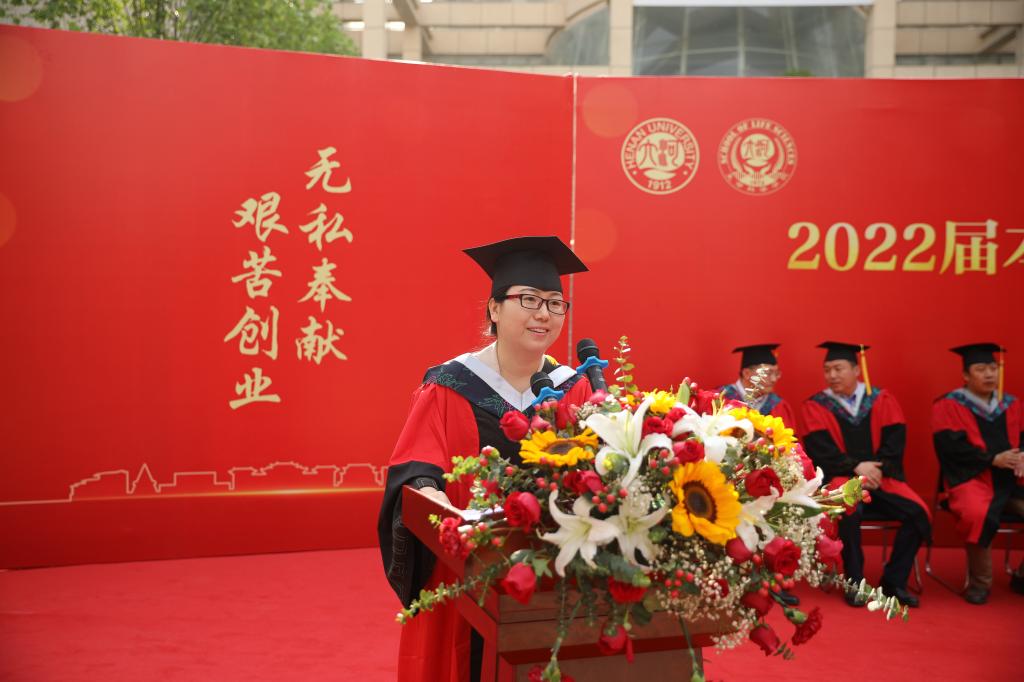 校园的花开得正美,清雅的芬芳中有一丝丝淡淡离愁;学院楼前的树正绿,蓊郁的绚烂中有一句句殷殷嘱托。教师代表、学院生物工程卓越工程师班班主任孙杨深情回忆起开满梓花儿的中州路、先闻湖中的黑天鹅、琴键楼下的匆匆身影、创业中心的美食以及生科牌啤酒,感情真挚地表达了对毕业生们的祝贺与不舍。他勉励毕业生们每一段旅程的终点,都是下一段旅程的起点,要始终不断奔跑;要珍惜时光,不负光阴;要坦然接受生活的变化;要脚踏实地,志存高远。他希望毕业生们纵然经历人世冷暖,回头笑容依然纯真温暖。