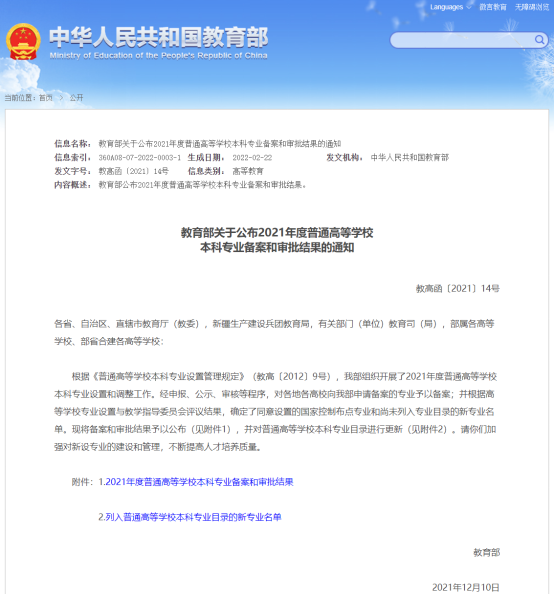 近日,教育部公布了2021年度普通高等学校本科专业备案和审批结果的通知(教高函〔2021〕14号),永利集团304am登录申报的生物信息学(071003)专业获教育部批准备案。