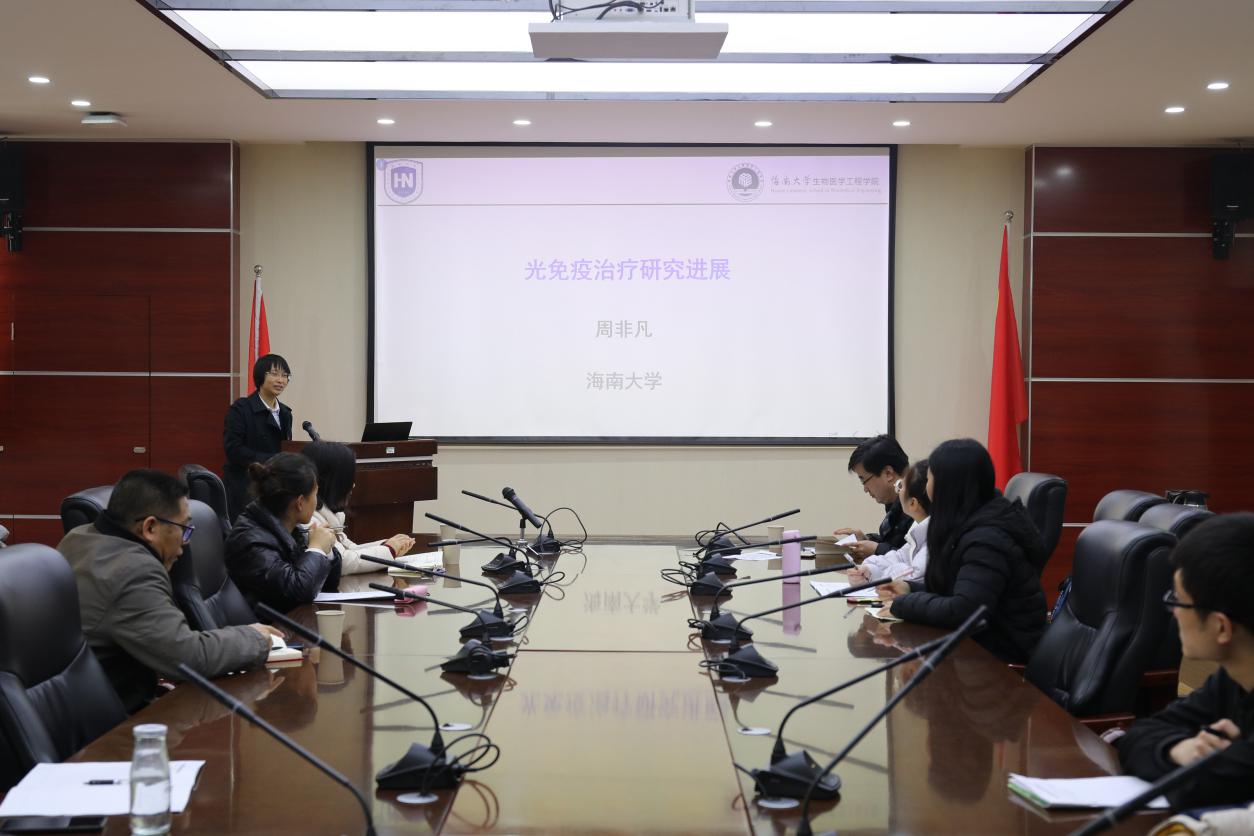 2020年12月7日上午,2020年第9期,总第171期 “生物学前沿学术交流研讨会”(Biology cutting-edge Academic Exchange Seminar,简称“BAES”)永利集团304am登录研究生院组织的学术报告在永利集团304am登录B201举行。海南大学生物医学工程学院周非凡教授在此作题为“肿瘤光免疫治疗研究进展”的学术报告。来自永利集团304am登录生物学专业的全体研究生出席了报告会。会议由永利集团304am登录副院长赵翔主持。