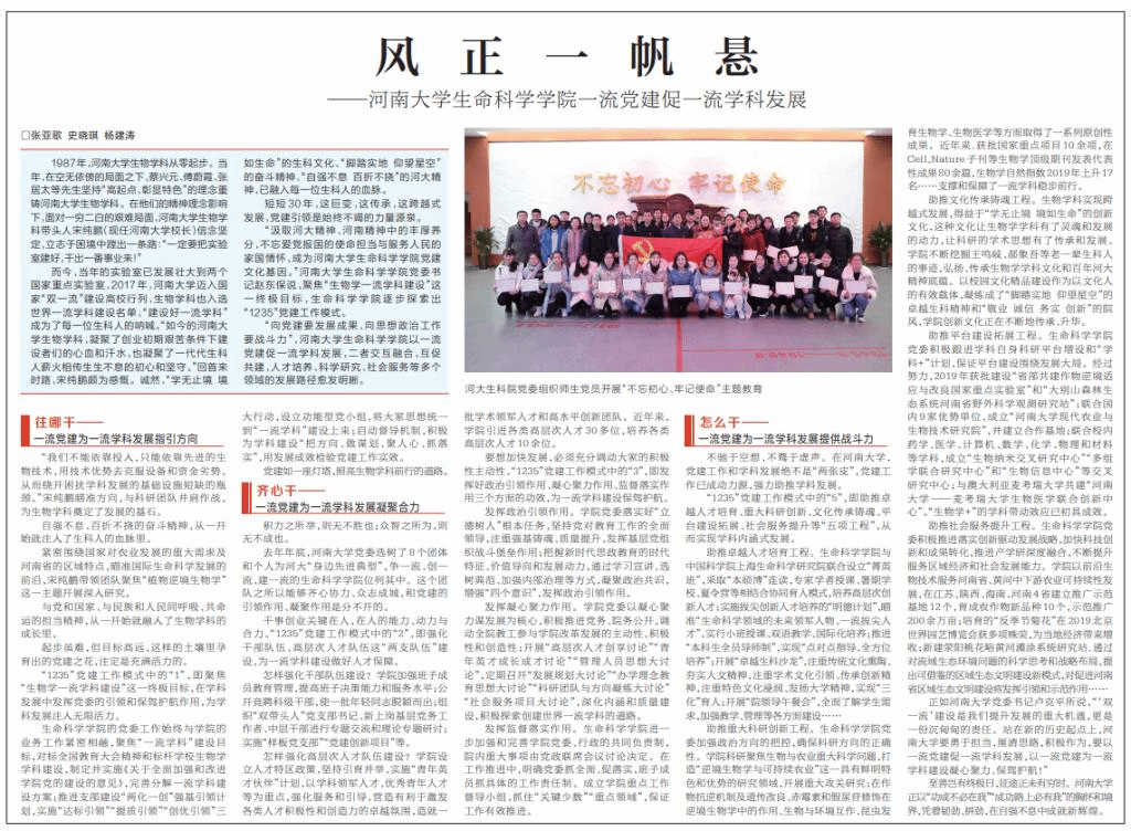 “汲取河大精神、河南精神中的丰厚养分,不忘爱党报国的使命担当与服务人民的家国情怀,成为永利集团304am登录党建文化基因。”永利集团304am登录党委书记赵东保说,聚焦“生物学一流学科建设”这一终极目标,永利集团304am登录逐步探索出“1235”党建工作模式。