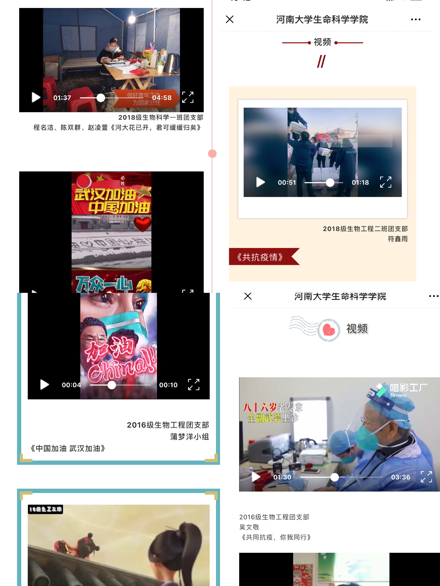 各团支部结合实际,坚持团结向上、积极正面的导向,结合学院学科特色,组织团员创作青年学生喜闻乐见、内容健康、形式多样的线上文创作品(海报、短视频、PPT等),选取优秀作品,通过学院微信公众号平台进行展示,充实团员青年精神文化生活,引导团员青年正确认识疫情,讴歌主旋律,凝聚正能量。