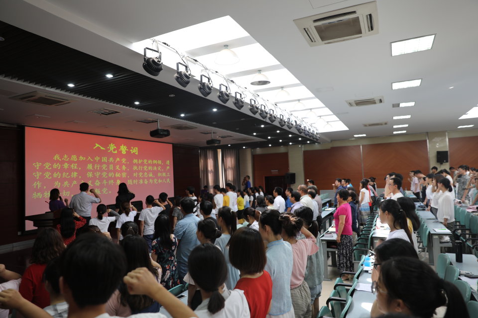 在学院党委带领下,参与大会的新党员进行了入党宣誓,老党员重温誓词。宣读誓词期间,每位党员都将誓词高声诵读,铿锵有力的誓词声代表着每一位党员对党的忠诚与信仰,握紧的拳头,将党员的责任牢记在心。