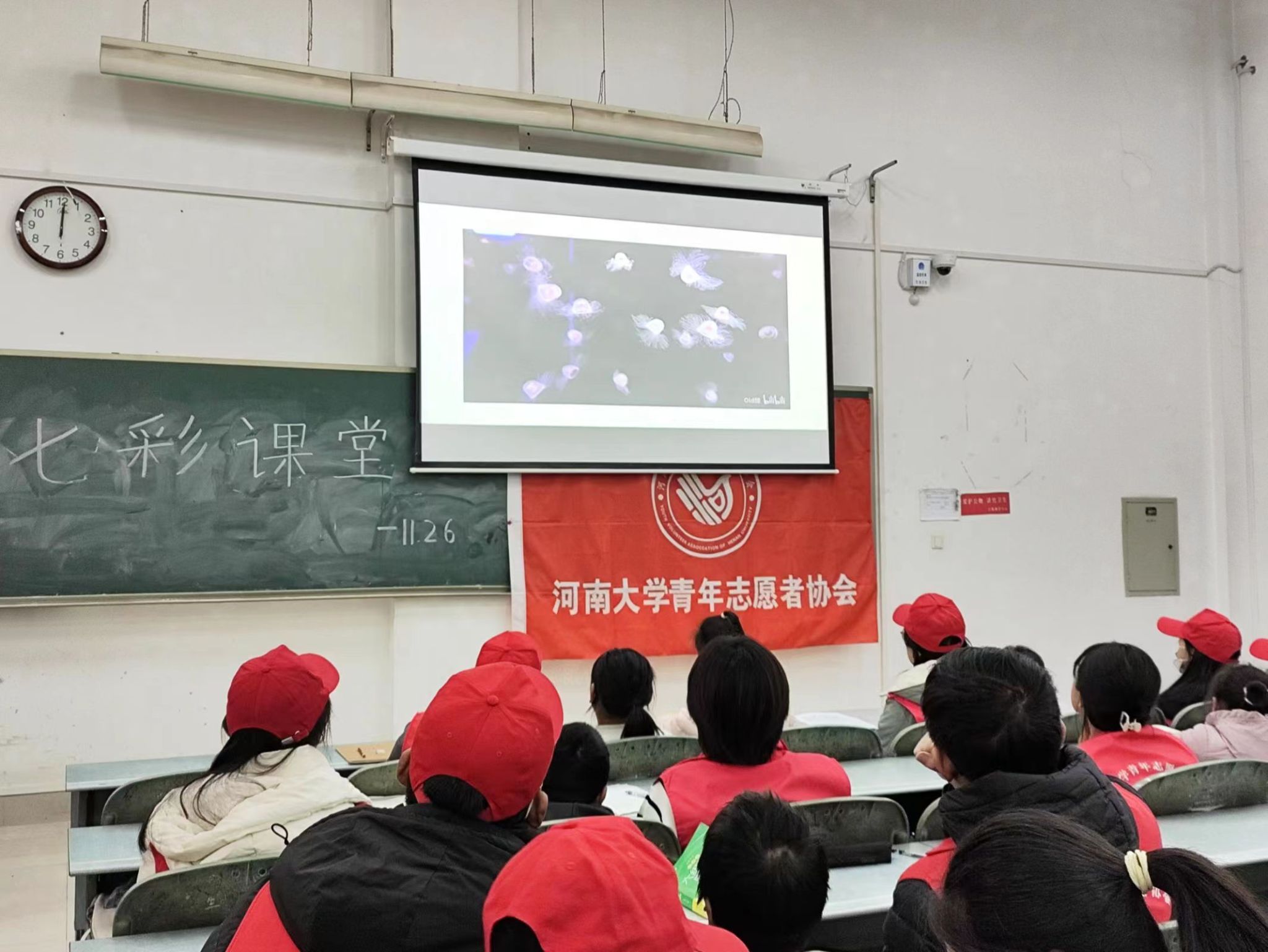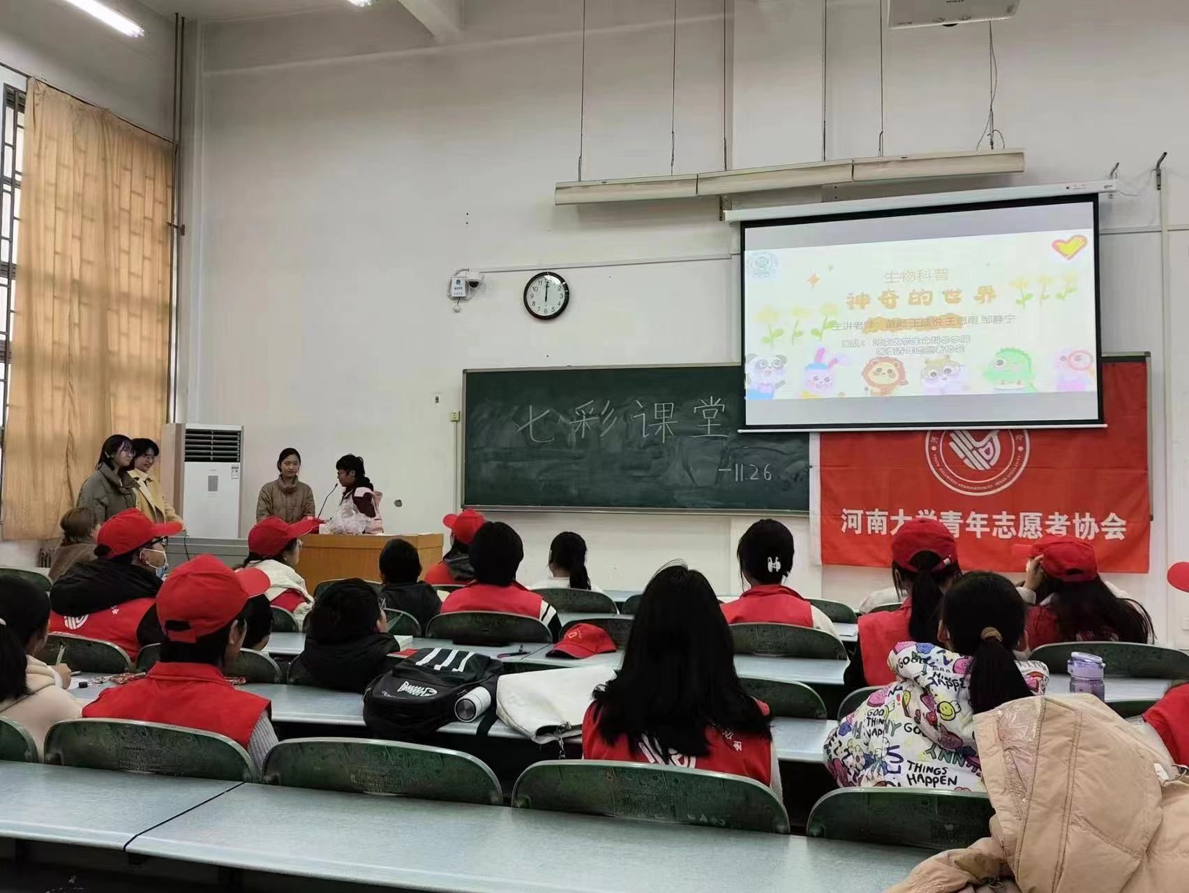 11月26日,永利集团304am登录青年志愿者协会结合专业特色,参与由校青协举办的“七彩课堂情满校园”志愿服务活动,在金明校区计算机报告厅为小朋友上了一堂生动的“生物奥秘”科普课。