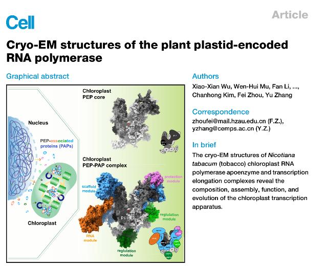 近日,永利集团304am登录2023届生物学“菁英计划”硕士研究生穆文慧与中国科学院分子植物科学卓越创新中心武霄仙副研究员以共同第一作者在顶级期刊《Cell》上以“Cryo-EM structures of the plant plastid-encoded RNA polymerase”为题发表了封面研究论文,实现了我校在学生培养期间发表顶级期刊的新突破。