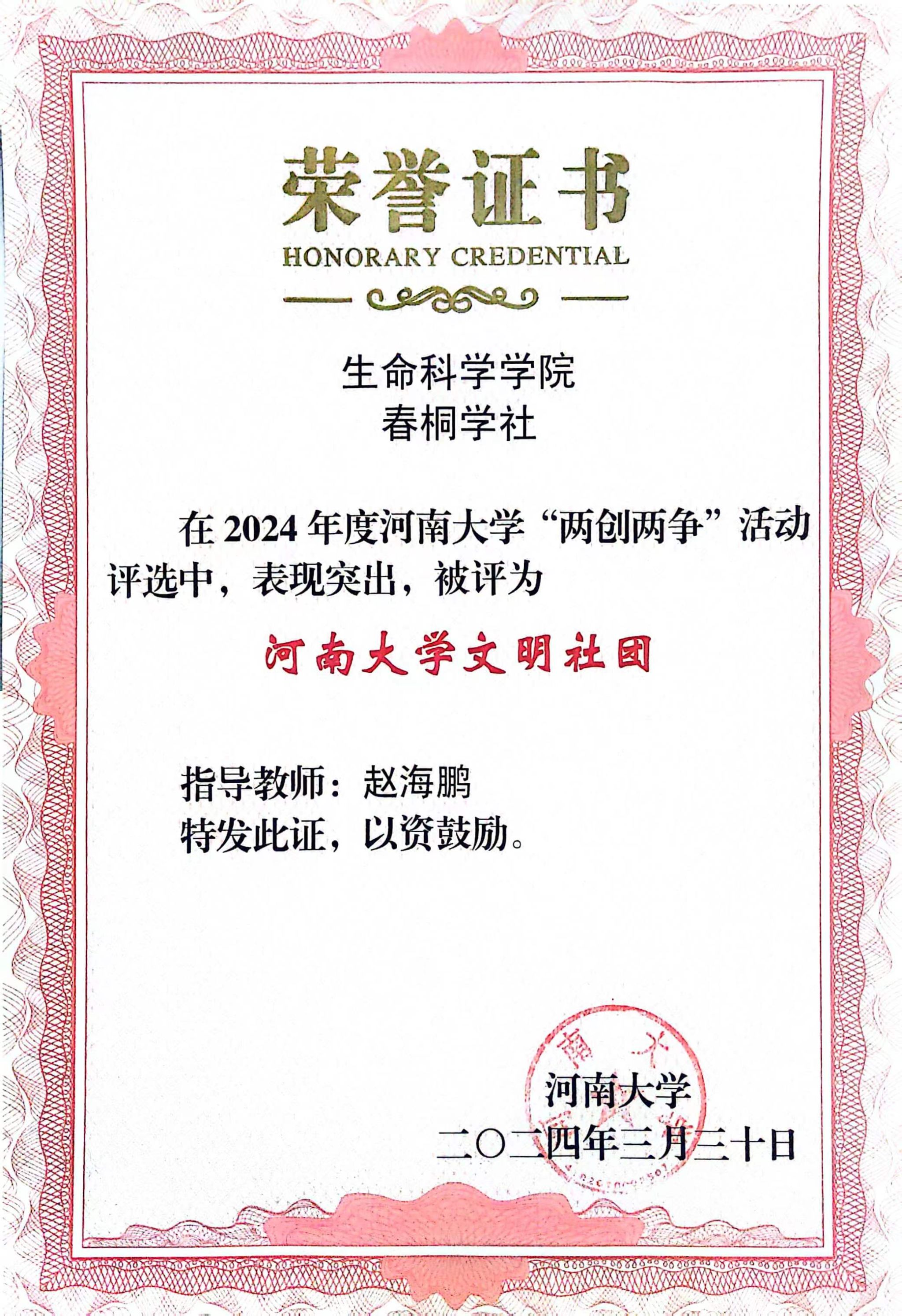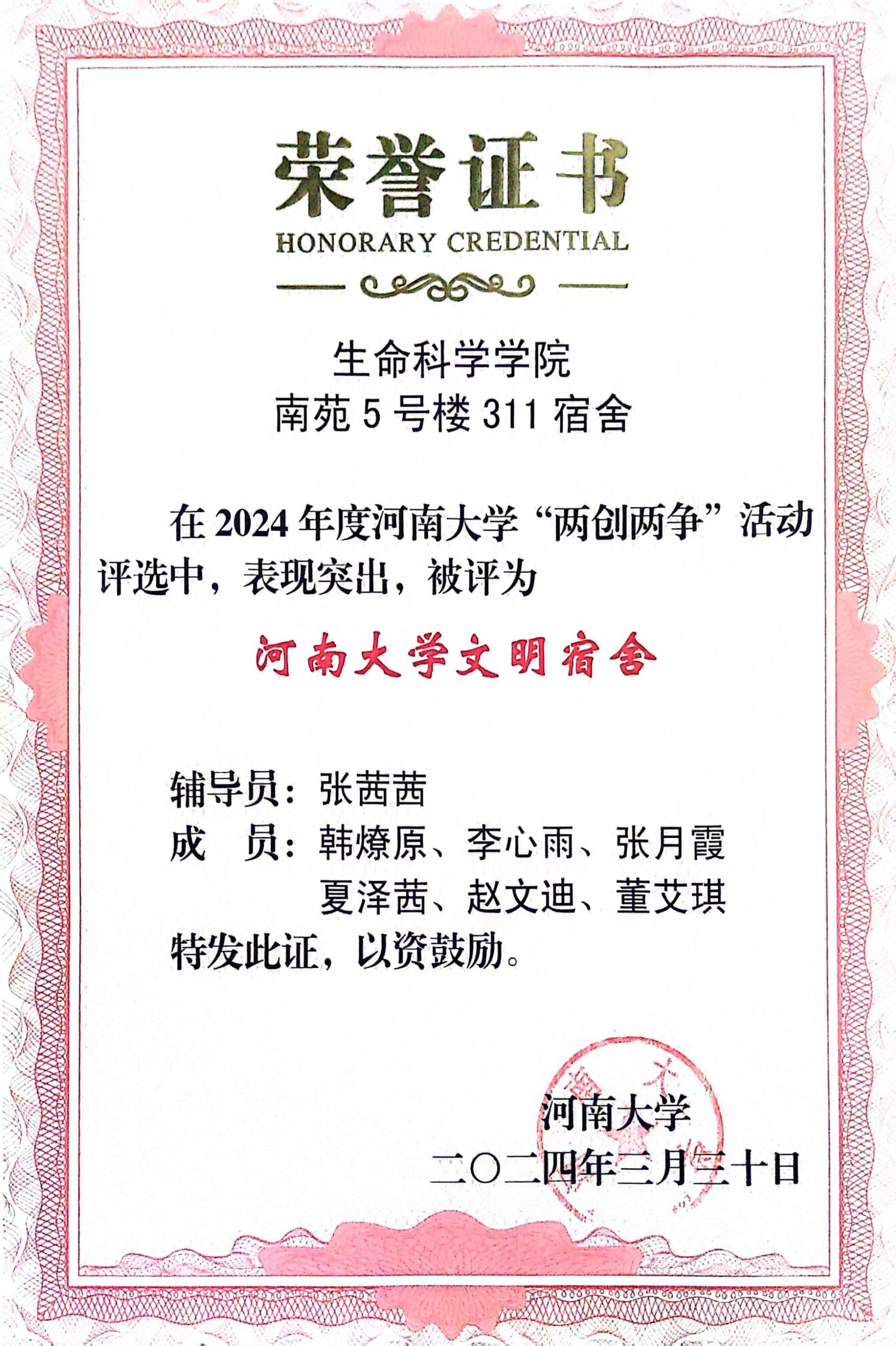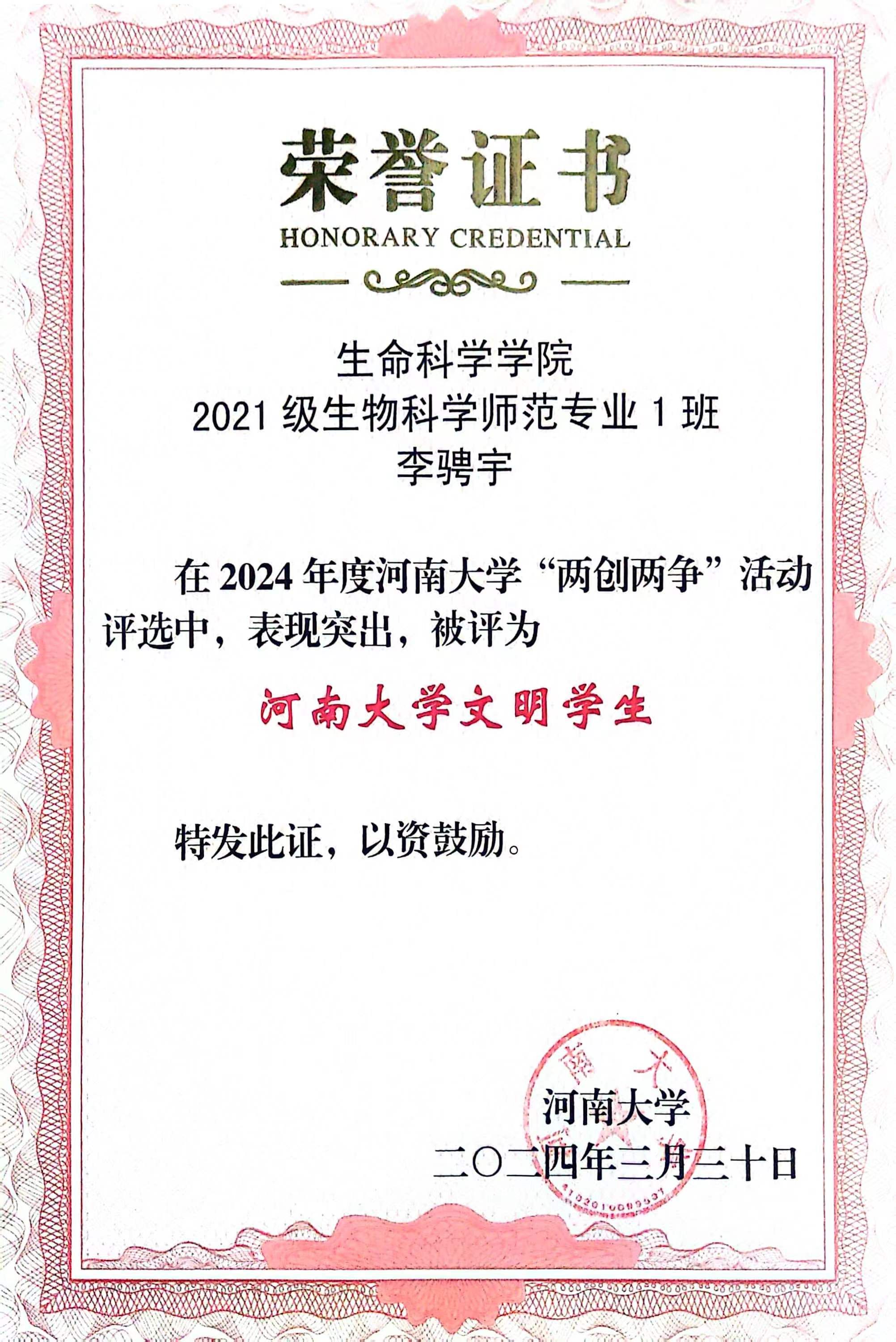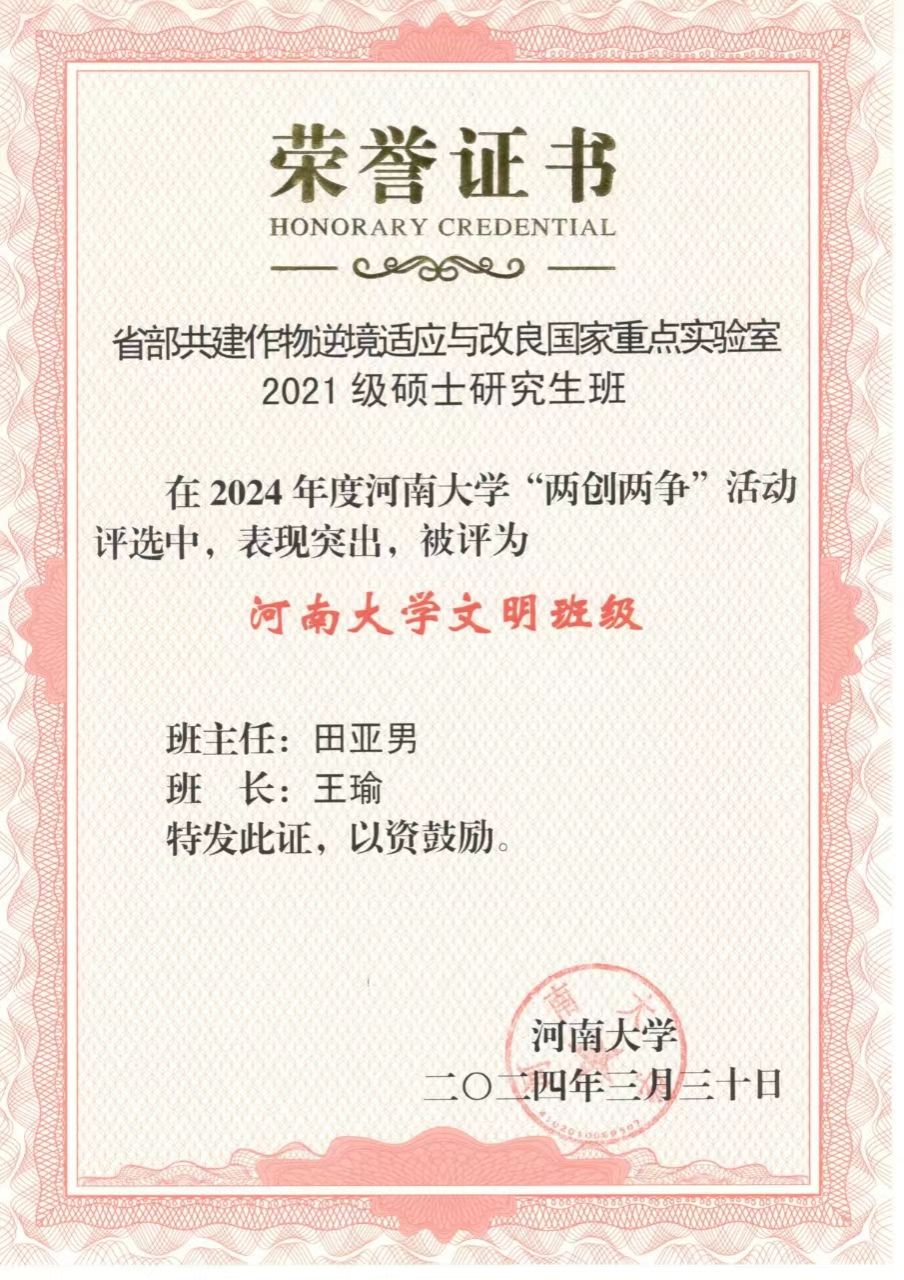 省部共建作物逆境适应与改良国家重点实验室2021 级硕士研究生班获“永利集团304am登录文明班级”荣誉称号,春桐学社荣获“永利集团304am登录文明社团”荣誉称号,2021级生物工程专业学生所在南苑5号楼311宿舍荣获“永利集团304am登录文明宿舍”荣誉称号,2021级生物科学专业1班的李骋宇荣获“永利集团304am登录文明学生”荣誉称号。
