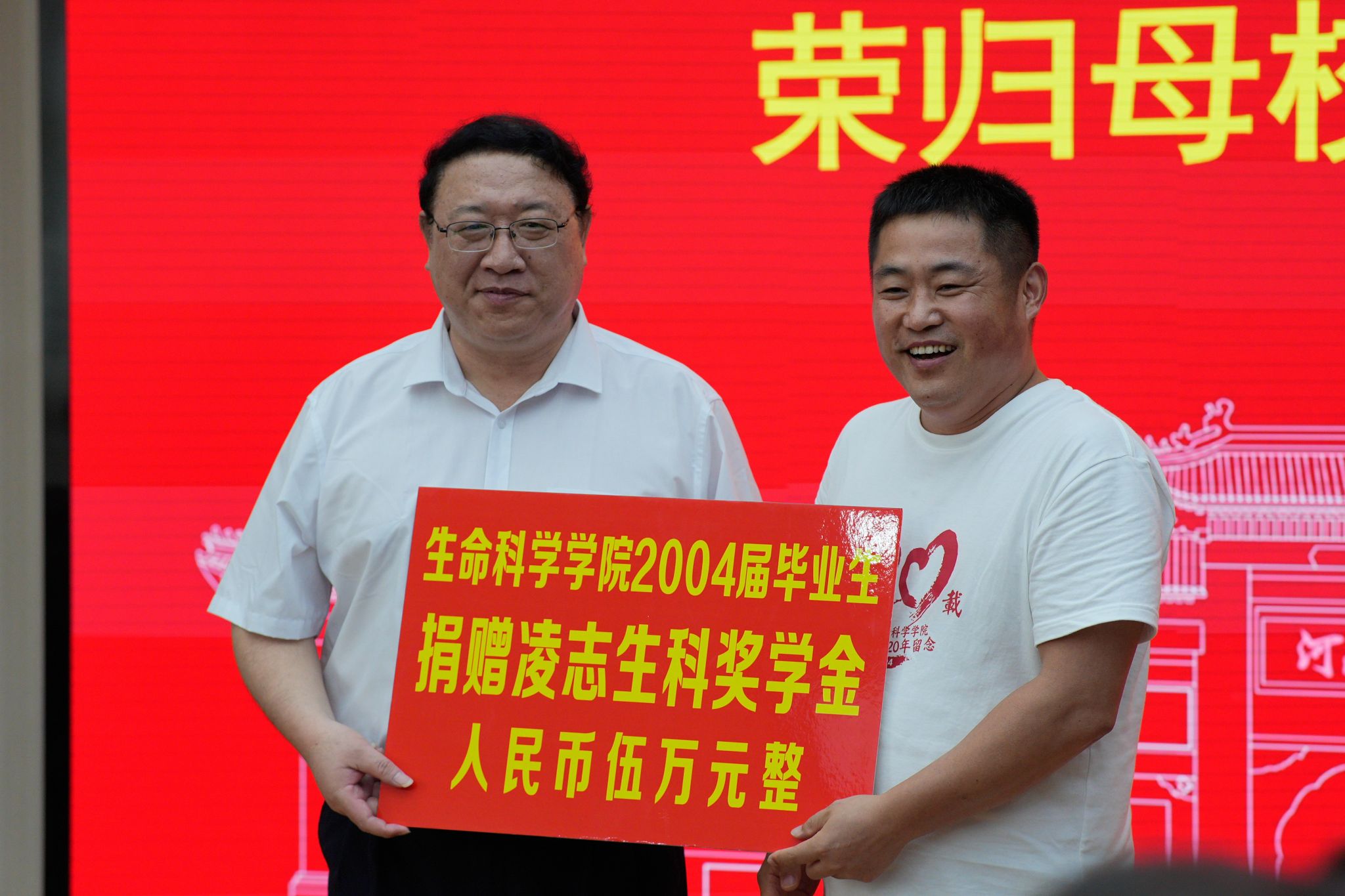 为感谢母校和老师培育之恩,资助家境贫困且品学兼优的生科学子,2004届毕业生向学院捐赠设立“凌志生科奖学金”,以实际行动支持着学院的发展。王刚代表学院为其颁发校友捐赠证书,并赠送学院文创纪念品,象征着校友与母校之间相互惦念的情感联结。