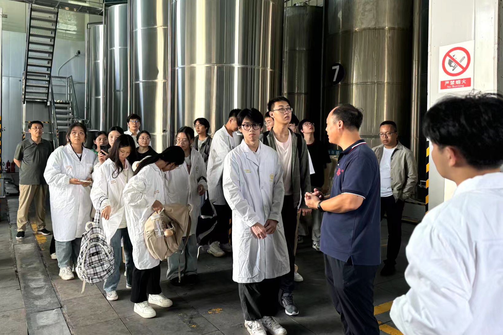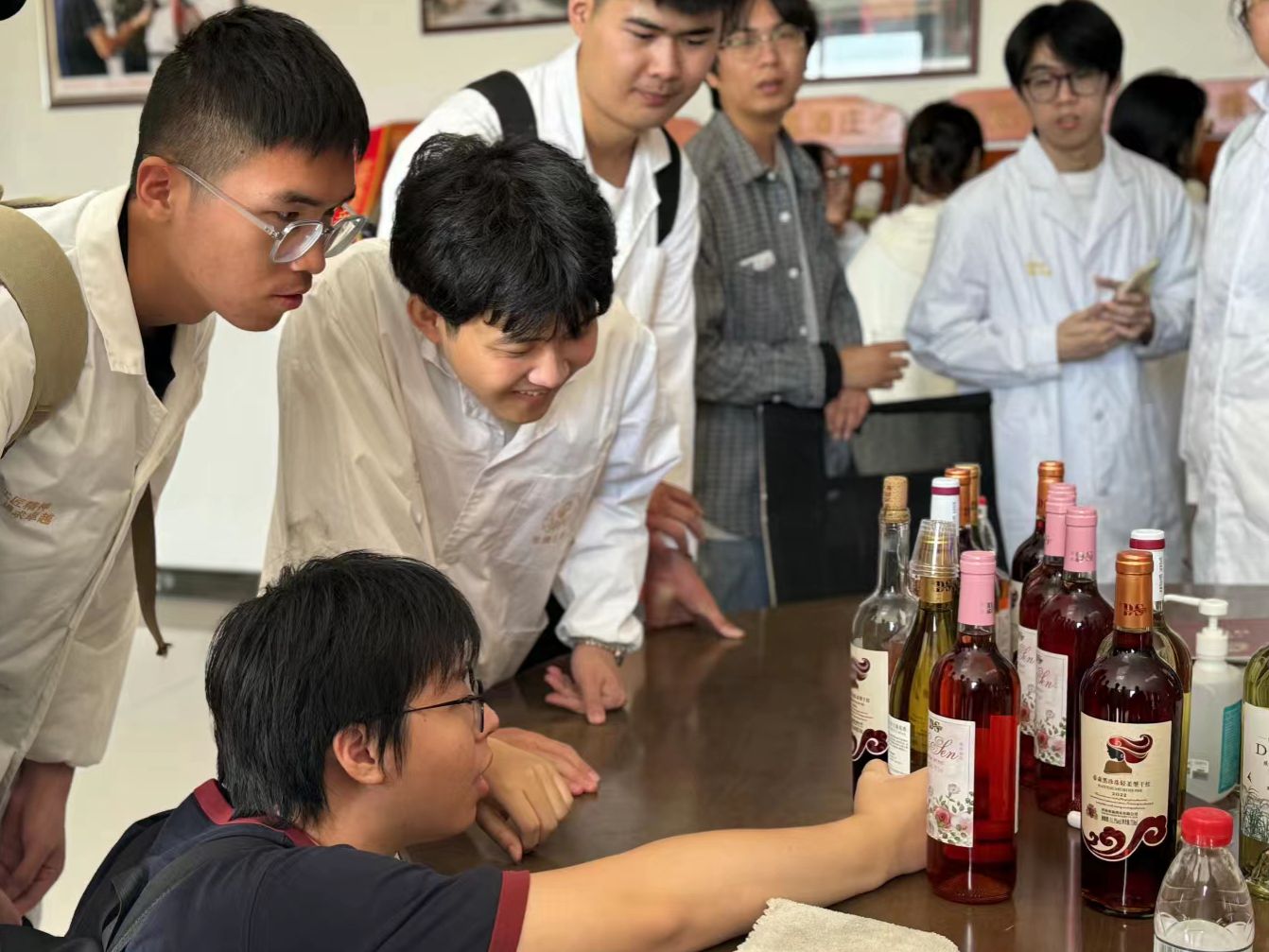 随后,大家来到公司的酿造车间、酒窖与展厅。同学们亲眼见证了葡萄采摘后由除梗破碎、榨汁到酿造的全过程,展厅里琳琅满目的葡萄酒展品更令人眼界大开。赵子牛、沈海坤耐心解答同学们关于葡萄酒生产工艺以及葡萄酒新品研发、窖藏以及销售方面的问题。公司荣誉墙上展出的多项国际国内大奖让同学们更加认识到本专业在服务国民经济发展中大有可为,增强了专业自信和自豪感。