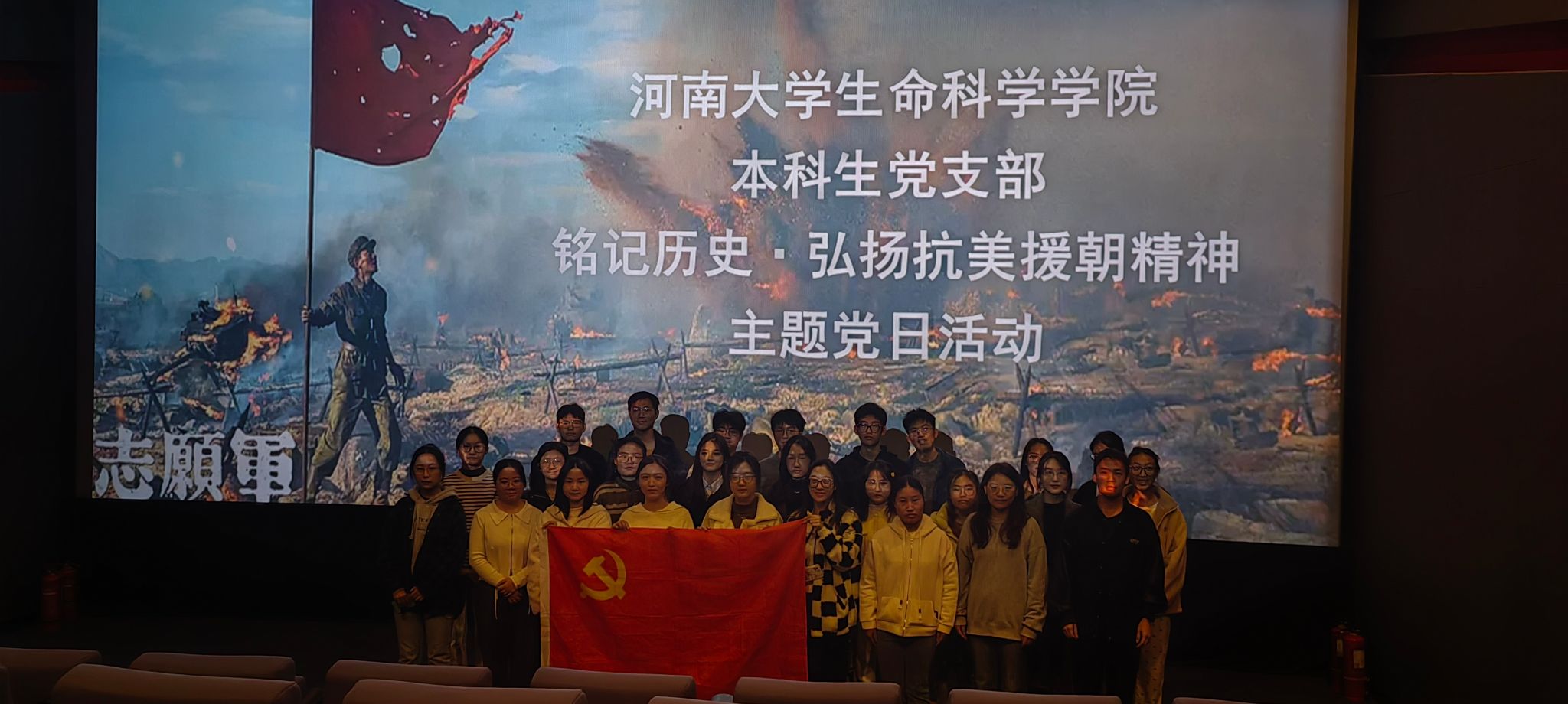 为深入学习传承抗美援朝精神,弘扬党的优良传统和红色基因,提高党组织的凝聚力和战斗力,永利集团304am登录本科生党支部联合开展“铭记历史 弘扬抗美援朝精神”主题党日活动,40余名学生党员共同观看专题影视作品《志愿军:存亡之战》。