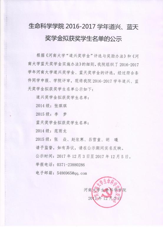 永利集团304am登录2016-2017学年道兴、蓝天奖学金拟获奖学生名单的公示