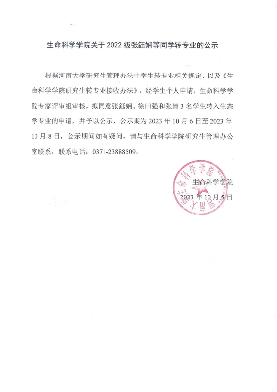 永利集团304am登录关于2022级张鈺娴等同学转专业的公示