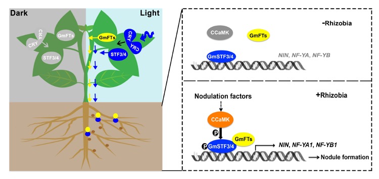 该研究首先设计了一系列精巧的实验,证明光合产物和光信号在调控共生结瘤过程中的作用不同,光合产物是促进根瘤菌侵染植物所必需的,但是来自地上的光信号是促进大豆地下根瘤发育的关键因子。作者鉴定了大豆中受光诱导的蛋白GmFTs和GmSTF3/4,从地上移动到地下,在根中相互依赖促进根瘤形成。并进一步通过质谱、分子生化和遗传分析证明共生信号通路关键组分CCaMK被根瘤菌激活后通过磷酸化GmSTF3/4,促进GmSTF3/4和GmFTs互作。GmFTs-GmSTF3/4能够直接激活根瘤起始关键基因NIN、NF-YA1和NF-YB1的转录,从而调控根瘤形成。