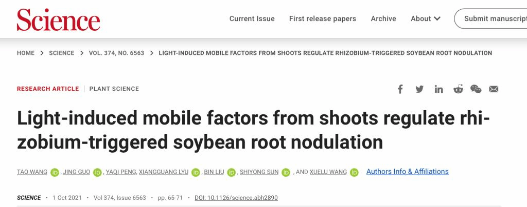 2021年10月1日,永利集团304am登录作物逆境适应与改良国家重点实验室王学路团队在Science上发表了题为Light-induced mobile factors from shoots regulate rhizobium-triggered soybean root nodulation的研究论文,揭示了大豆中受光诱导表达的GmFTs(FLOWERING LOCUS T)和GmSTF3/4(orthologs of LONG HYPOCOTYL 5)从地上移动到地下,在根中被根瘤菌激活的共生信号关键组分CCaMK磷酸化激活,诱导根瘤形成的机制。